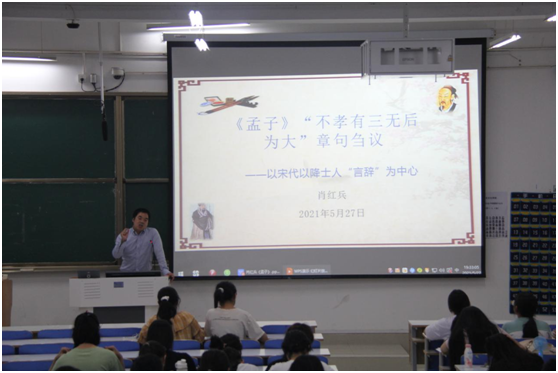5月27日晚,beat365官网肖红兵老师在社科楼212教室作题为“《孟子》‘不孝有三无后为大’章句刍议”的学术讲座,2019级历史学全体本科生到场听讲。