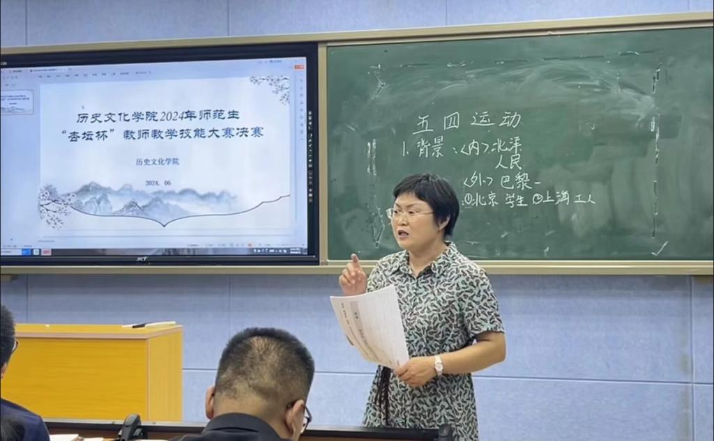 为提高历史学师范生教育教学技能,更新教学理念,提高综合素质和实践能力,6月11日下午,beat365英国官方网站在人文楼706教室举办了2024年师范生“杏坛杯”教师教学技能大赛决赛。宋基中学青年教师温二虎,学院副院长孙炜、李志坚,任课老师张乐锋、李海霞、张珍珍等6名教师担任评委,8位同学参赛,2023级本科生到场观摩了此次比赛。