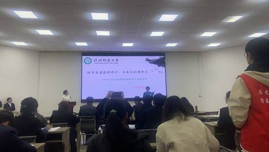 比赛分汇报和答辩两个环节。在汇报环节,朱娜代表汉风楚韵队从选题背景与目的、研究对象介绍、访谈过程、访谈成果、访谈感想等五个方面进行了汇报。在答辩环节,朱娜和张书博代表汉风楚韵队对评委老师们提出的问题,进行了有针对性的回答。汉风楚韵队的汇报和答辩得到了评委老师们的好评。