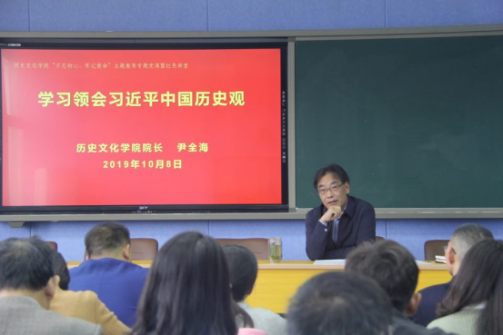 10月8日,根据beat365官网“不忘初心、牢记使命”主题教育的安排部署,院长尹全海在人文楼706会议室为全院师生党员作了题为“学习领会习近平中国历史观”的专题党课。院党委书记李军辉主持了此次党课。