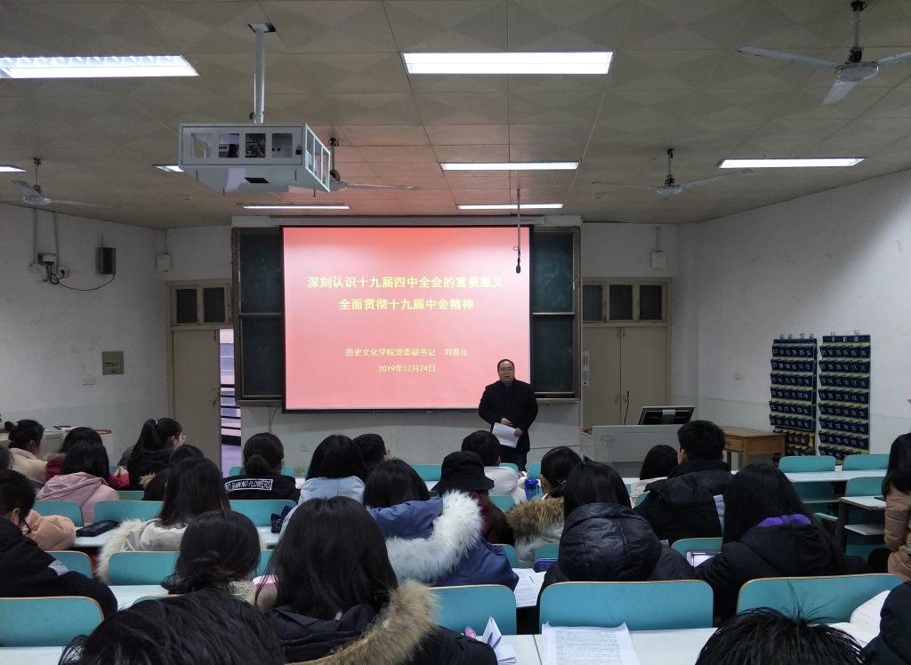根据学院统一安排,1224日下午,党委副书记刘喜元在人文楼509教室为全院学生党员作了题为“深刻认识十九届四中全会的重要意义,全面贯彻十九届中会精神”的专题党课。