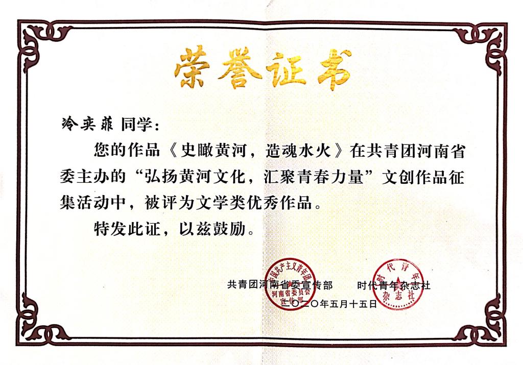 近日,由共青团河南省委主办,由共青团河南省委宣传部、时代青年杂志社、河南省青少年全媒体中心承办的“弘扬黄河文化,汇聚青春力量”文艺作品征集活动落下帷幕。beat365官网2018级历史学1班学生冷奕菲作品《史瞰黄河,造魂水火》被评为文学类优秀作品。