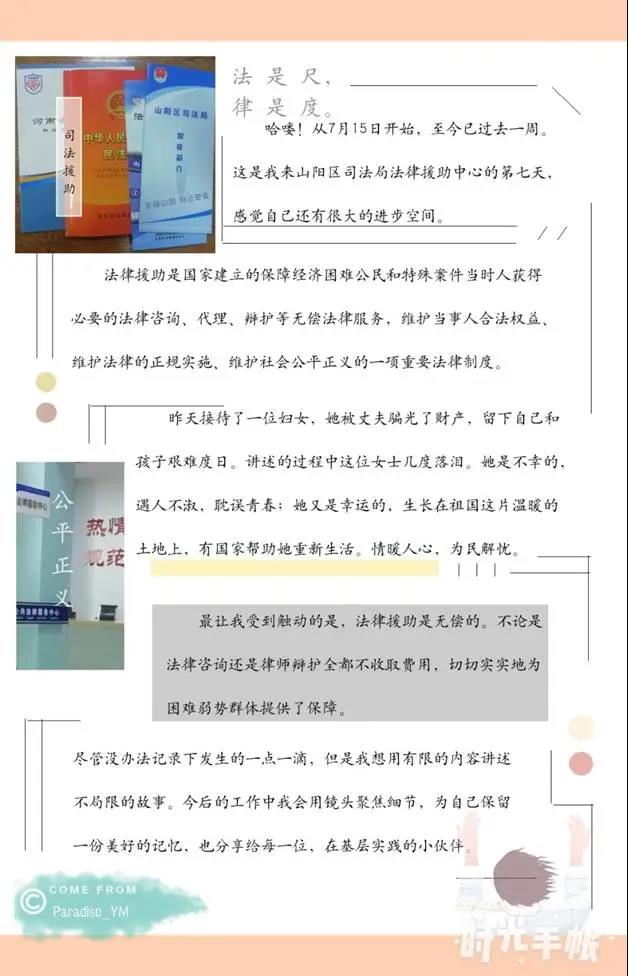 刚进到一个陌生的环境,我内心是惴惴不安的,办公室里几位姐姐很是亲切,给我分了自己的办公桌,带着我熟悉环境,她们的关怀让我逐渐放松,渐渐适应了工作。这是我工作中留下的一篇日志。一直以来,法律给我的印象都是冷冰冰的,但是在法援,我感受到了法律的温度。法律援助是国家建立的保障经济困难公民和特殊案件当事人获得必要的法律咨询、代理、辩护等无偿法律服务,维护当事人合法权益、维护法律的正规实施、维护社会公平正义的一项重要法律制度。情暖人心,为民解忧。