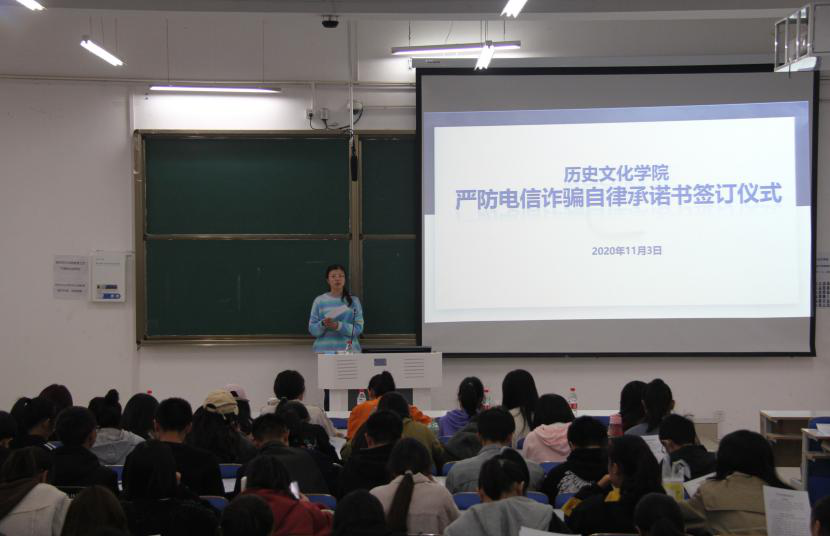 11月3日,beat365官网团委老师付亚男在社科楼212教室主持进行严防诈骗安全意识教育和自律承诺书签订仪式,beat365官网全体2020级新生参加。