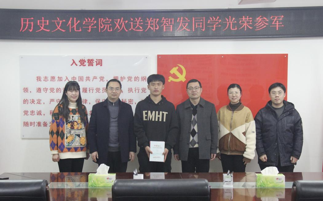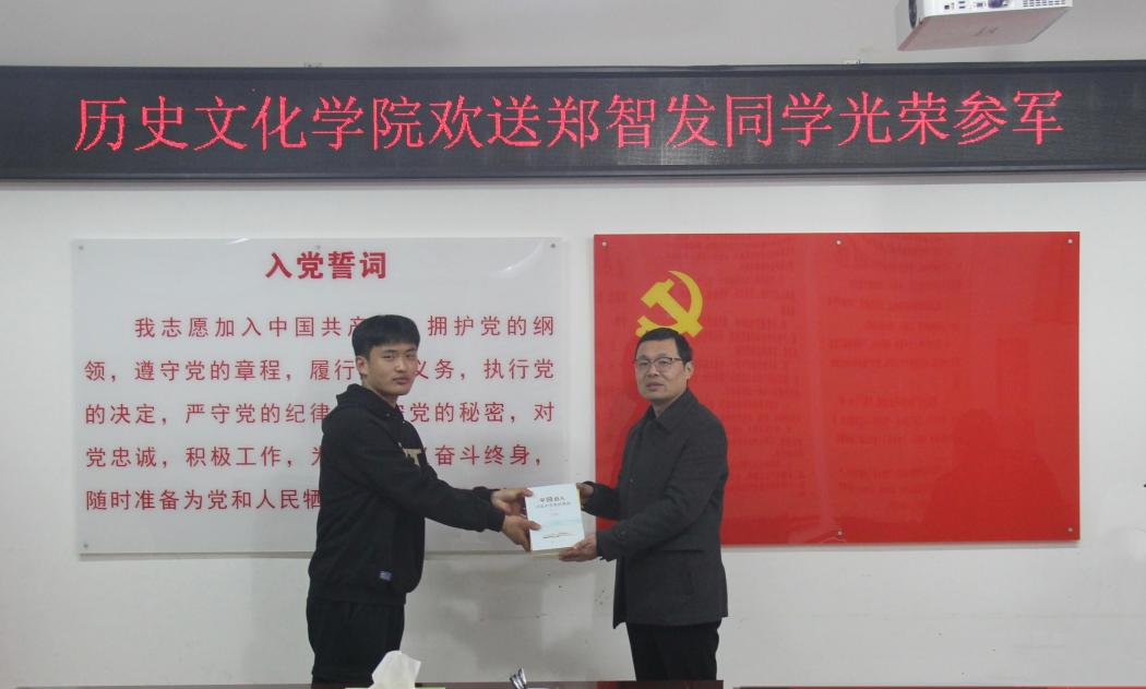 3月3日下午,beat365官网在人文楼805举行欢送2021级学生郑智发光荣入伍仪式,学院党委书记李辉、党委副书记韩志宏、辅导员班主任吴慧娟、付亚男、邓皓与会。领导老师们表达了对郑智发同学的祝贺,并送上《平语近人——习近平总书记喜欢的典故》《平易近人——习近平的语言力量》《平易近人——习近平的语言力量之军事卷》《中国古代军事通识课》等书籍,希望他刻苦训练,勤于学习,文武兼修,报效祖国。