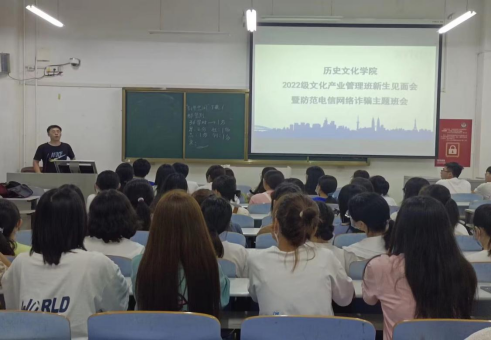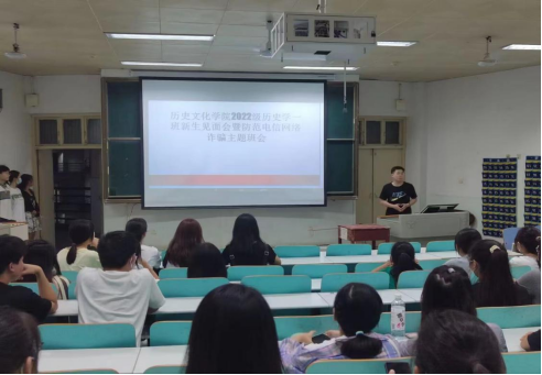 2022年9月18日晚beat365官网2022级新生见面会暨防范电信网络诈骗主题班会在人文楼举行。本次活动由2022级历史学及文化产业管理专业五个新生班同步举行各班班主任分别主持会议