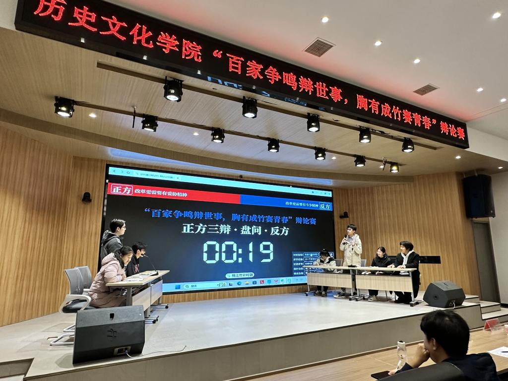 在欣赏了宋佳霖同学带来的原创歌曲《竹杖芒鞋》后,比赛正式开始。双方辩手首先分别进行自我介绍和观点阐述,正方观点为“改革更需要有妥协精神”,反方观点为“改革更需要有斗争精神”。在激烈的辩论过程中,辩手们充分展示了才华、智慧和团队精神,为观众带来了一场精彩纷呈的视听盛宴。特别是在自由辩论环节,双方辩手慧心妙舌,互不相让,彰显了双方辩手对于辩论主题的深人思考和充分准备。双方辩手们精彩的辩论让现场观众为之惊叹,他们的思考深入、见解独特,展现出了青年人的才情。比赛结束后,现场评委对参赛选手的表现进行了精彩点评和充分总结。