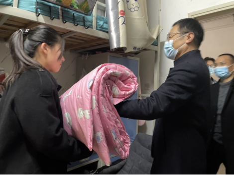 进入宿舍,领导老师们将爱心棉被发放到学生手中,仔细询问了同学们冬季御寒物品的置办情况,叮嘱同学们要切实注意冬季御寒保暖,学习生活中遇到问题要及时向老师反映。领导老师们热情关心同学们的生活,向同学们了解生活适应情况。此外,领导老师们还鼓励同学们珍惜时光,为期末考试做好充分的准备。