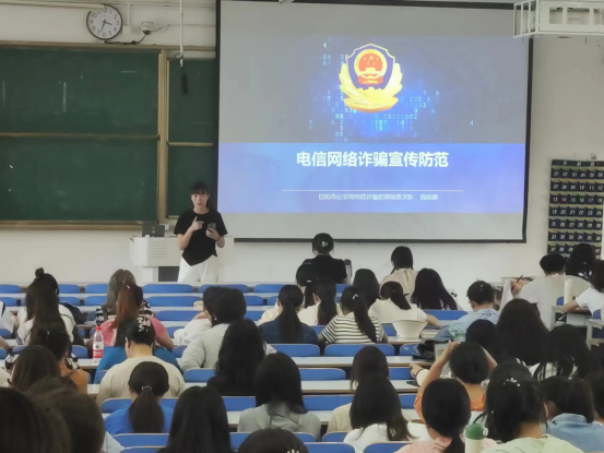 吴慧娟向同学们科普了常见诈骗类型及注意事项,生动形象地介绍了杀猪盘、网络贷款、网络兼职等常见的诈骗手法和案例,进行了细致入微的讲解,并通过分析身边真实的诈骗案例,向同学们传授了防范电信网络诈骗技巧。最后,他提醒同学们注意“六个一律、八个凡是”,在“灵魂八问”中告诫同学们培养反诈意识,为当前网络诈骗的高发态势敲响了防诈警钟。