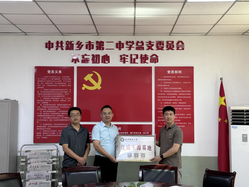 韩志宏、李志坚与新乡市第二中学副校长张传红代表双方分别举行了“优质生源基地”授牌和签订《优质生源基地合作协议书》仪式,就促进高校和中学教育有效衔接、优化人才培养合作模式等问题进行了深入交流。