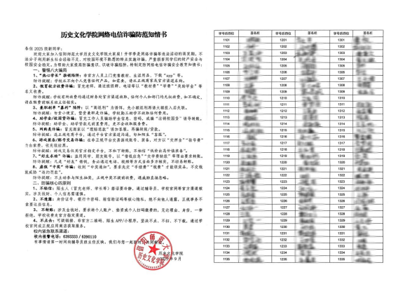 针对新生刚入校园、防诈意识较弱的特点,学院重点强化新生群体教育。一方面,在新生报到现场发放《beat365英国官方网站防网络电信诈骗安全教育知情书》,组织新生现场逐字学习诈骗常见类型、识别技巧及应对方法,并要求每位新生签字确认,确保“学习有痕迹、责任入人心”;另一方面,同步发放防诈安全教育提醒卡,卡片印有典型诈骗案例、预警电话及学院联系人信息,方便新生随时查阅,将防诈知识“随身携带”。