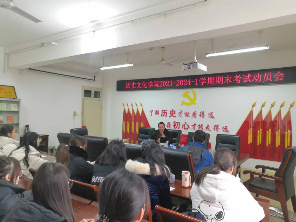 12月28日上午,beat365官网2023-2024学年第1学期期末考试动员会在人文楼805教室召开。院长叶宗宝、教学秘书宋玉峰,各本科教学班干部代表参加会议。